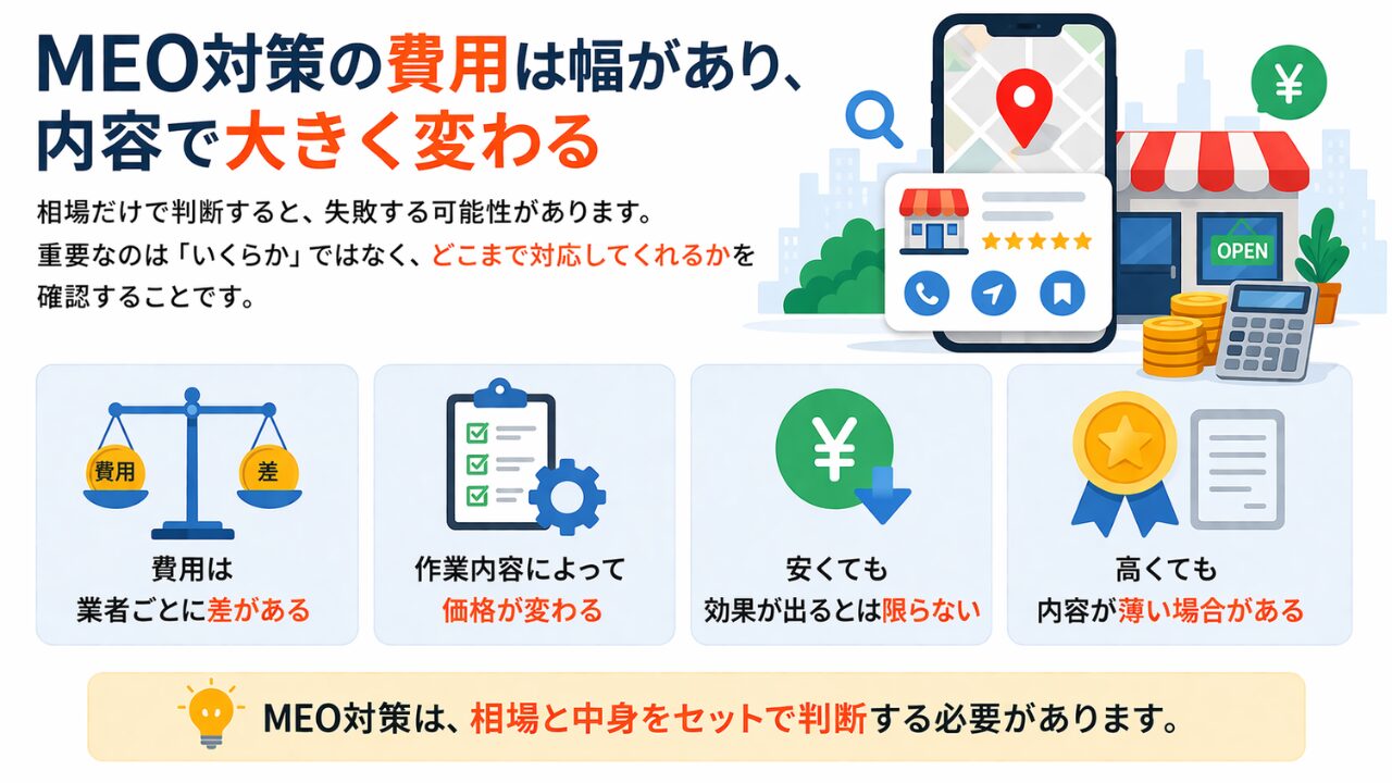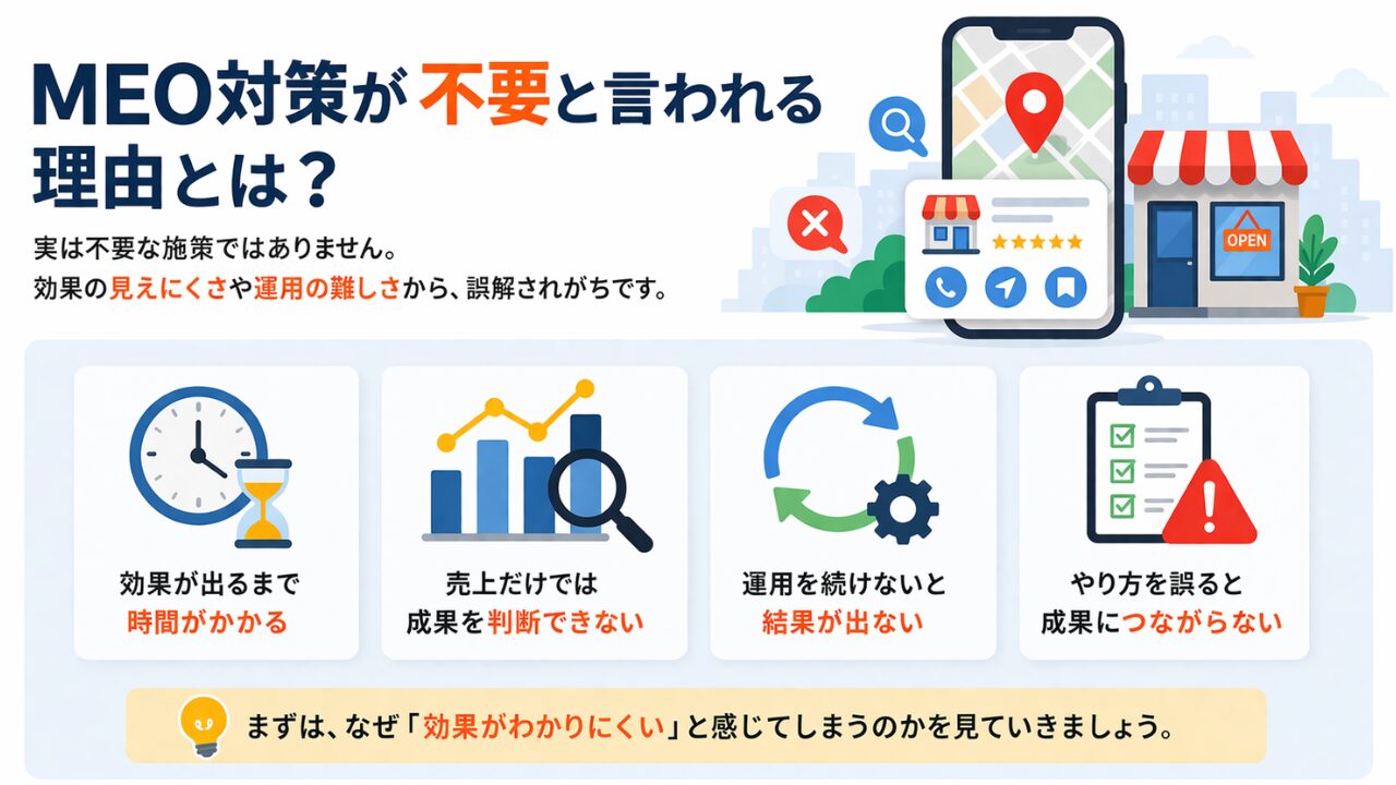 この記事では、MEO対策が不要と言われる理由から本当に必要なケース、費用の考え方までわかりやすく解説します。