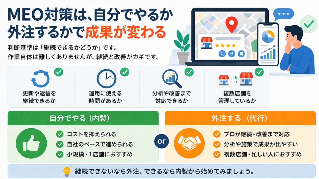 自分で継続できるなら内製、難しいなら外注が現実的な選択です。