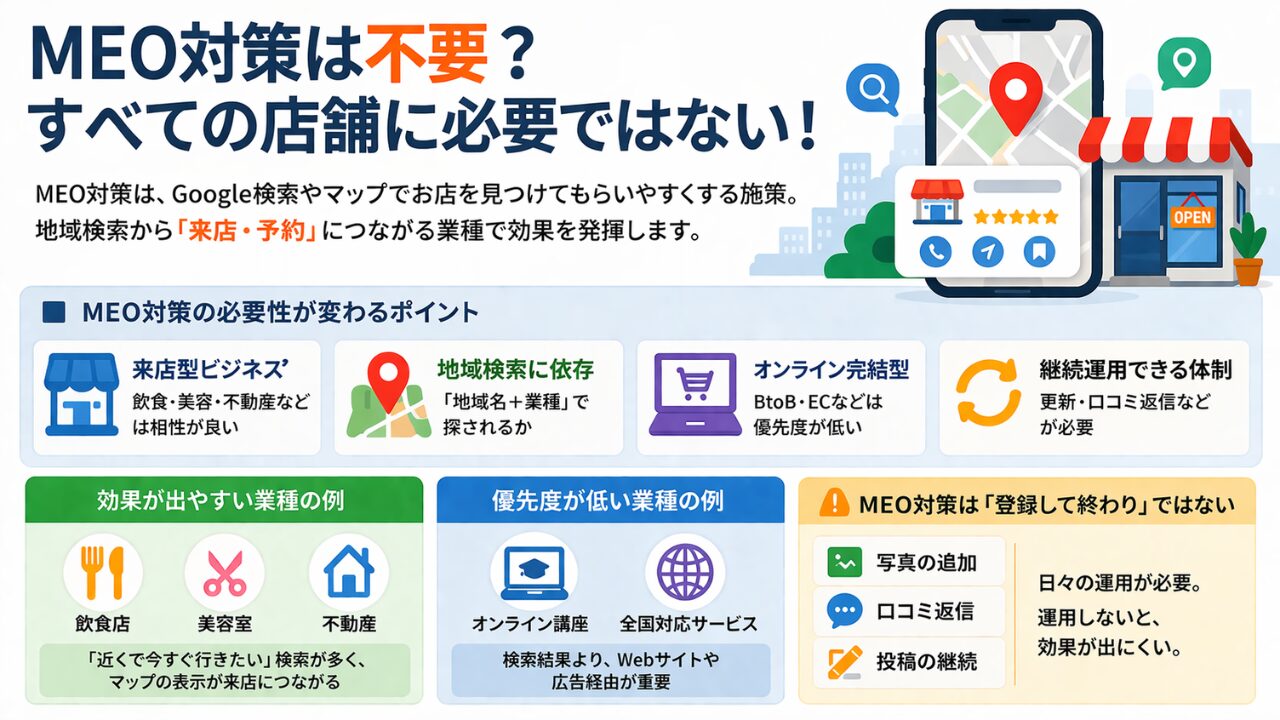 meo対策は、すべての店舗に必要な施策ではありませんが、地域検索が集客に直結する場合は重要な施策です。