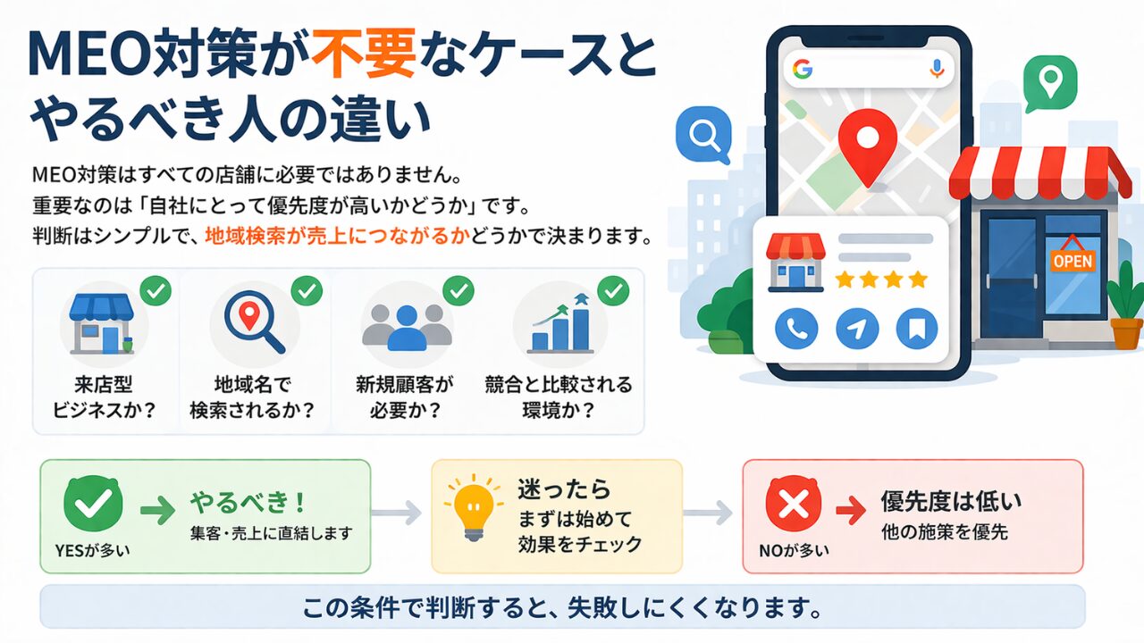 つまり、meo対策は「やるべきか迷う施策」ではなく、自社に合うかで判断する施策です。