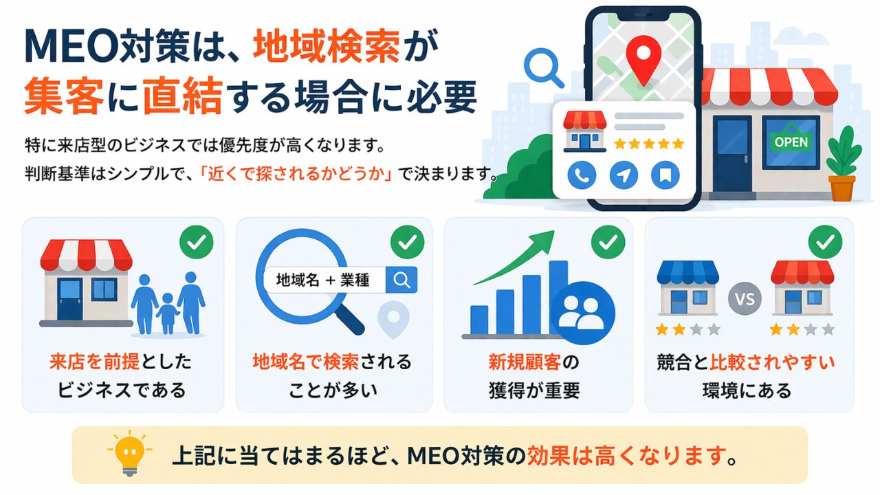 meo対策は、地域検索が集客に直結する場合に必要です。