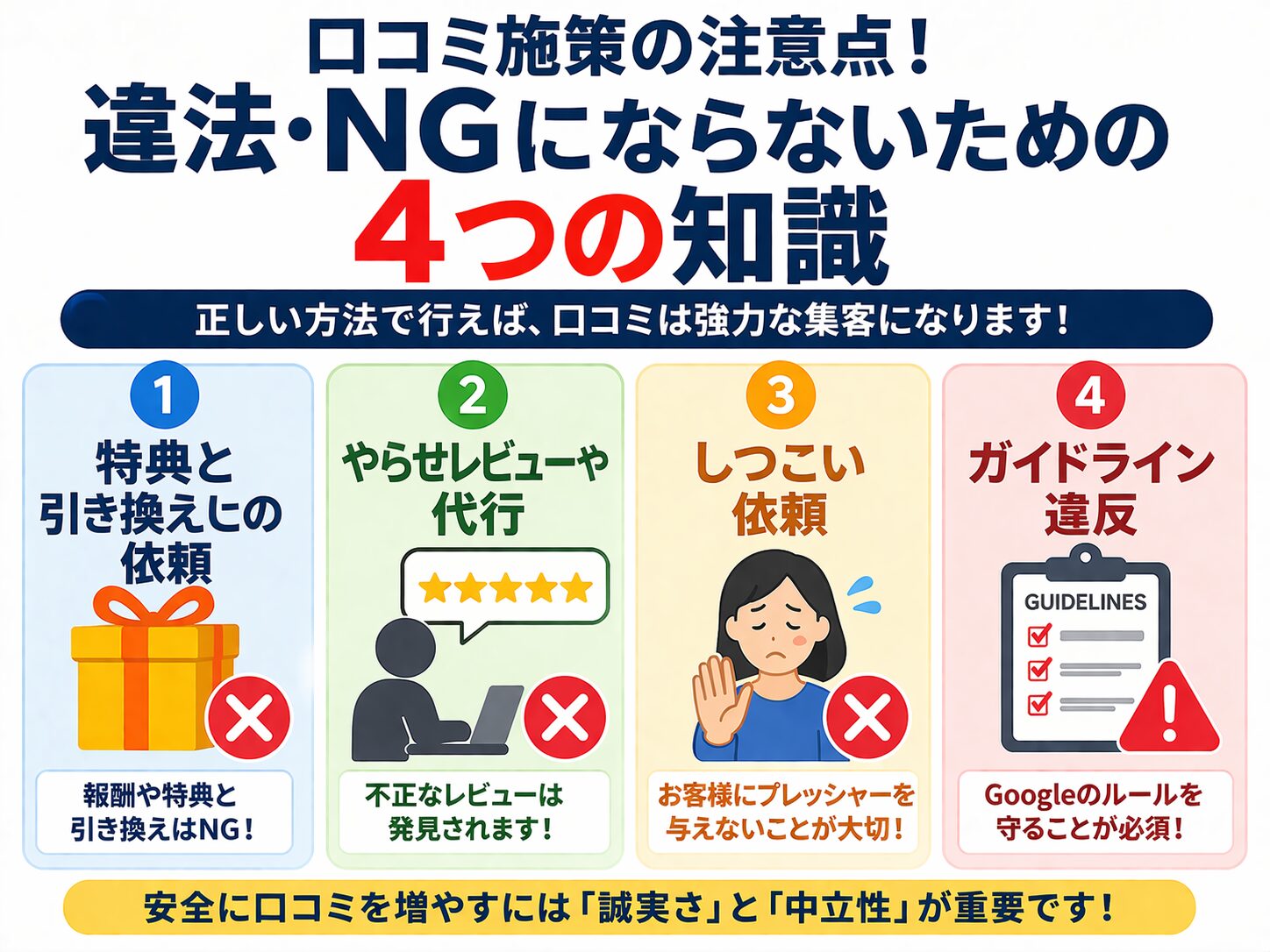 安全に口コミを増やすには「誠実さ」と「中立性」が重要です。
