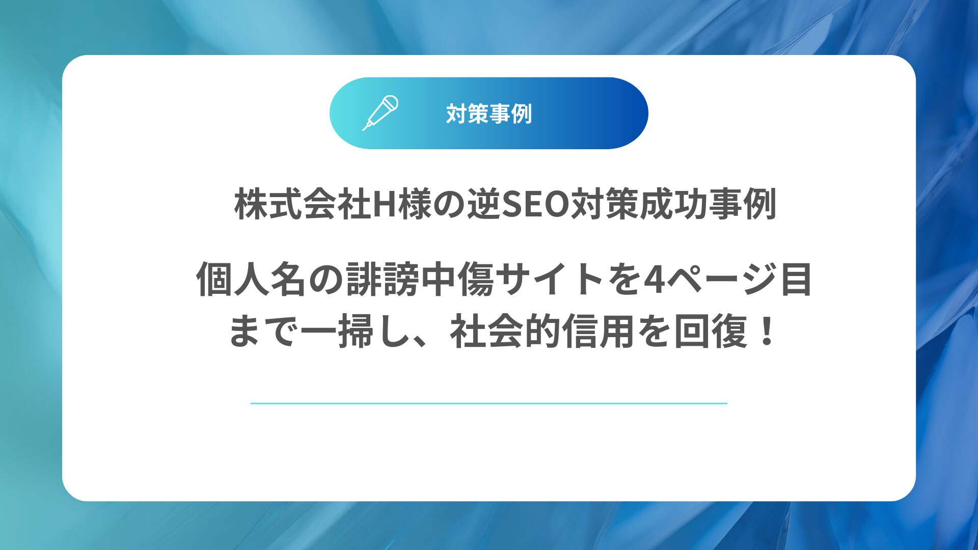 GoogleやYahoo!で「代表者個人名」を検索した際、事実無根の誹謗中傷が書かれた掲示板やブログが検索上位に複数表示され、取引先からの信用低下やプライバシーの侵害に悩まされていた株式会社H様。