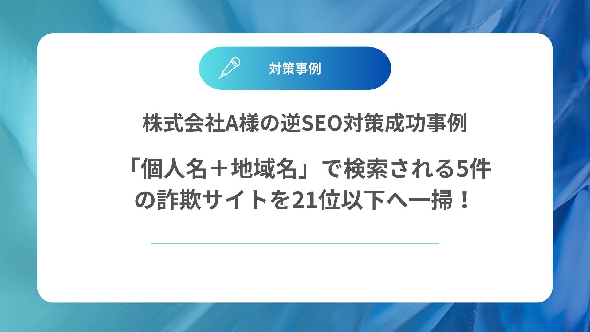 Google検索にて「個人名+地域名」で検索した際、全く関係のない詐欺サイトが1ページ目に5件も表示され、個人の信用だけでなく会社への不信感にも繋がっていた株式会社A様。